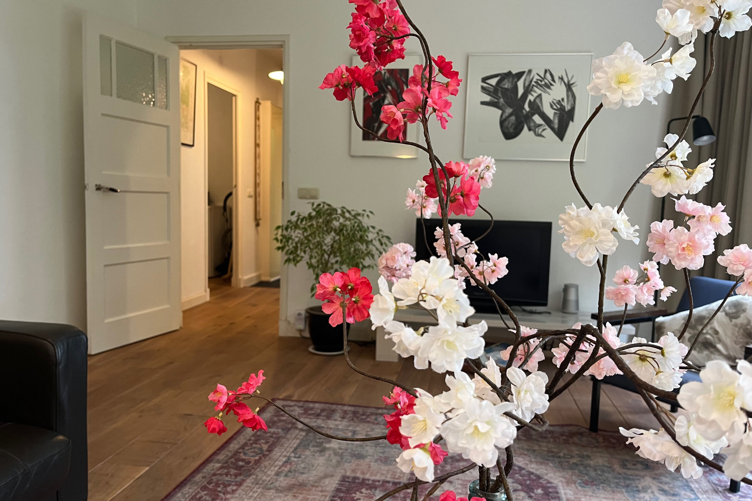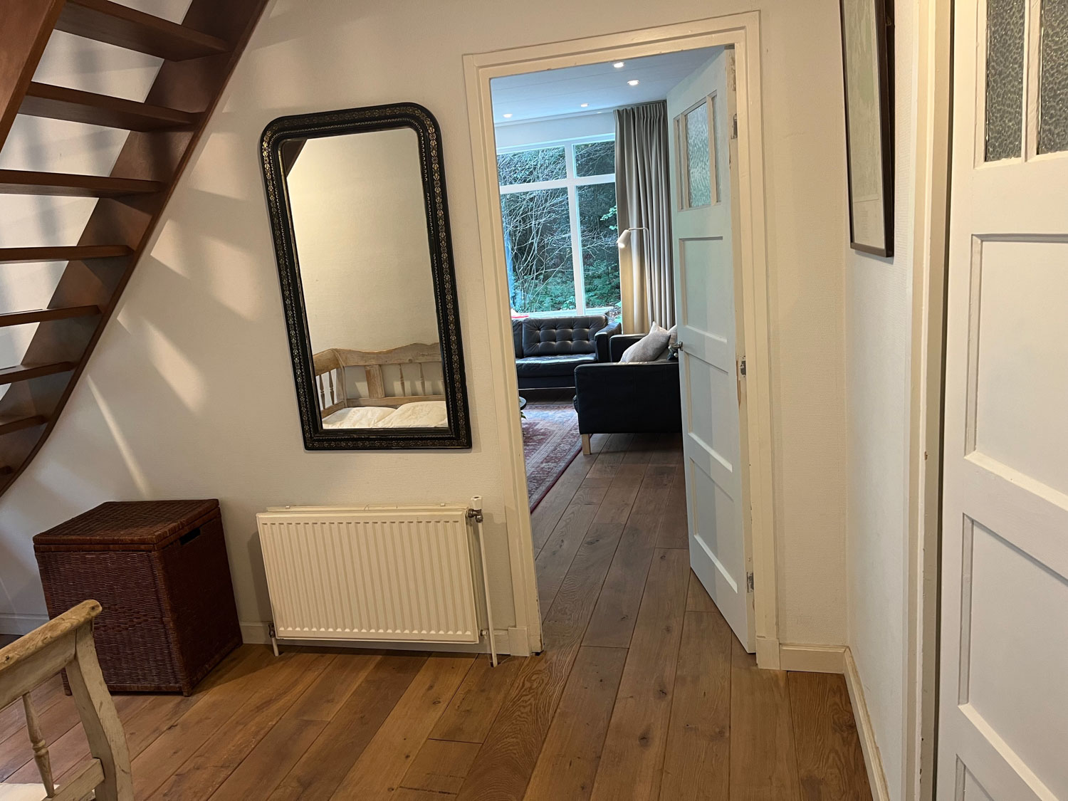 Ruime lichte woonkamer met uitzicht.
